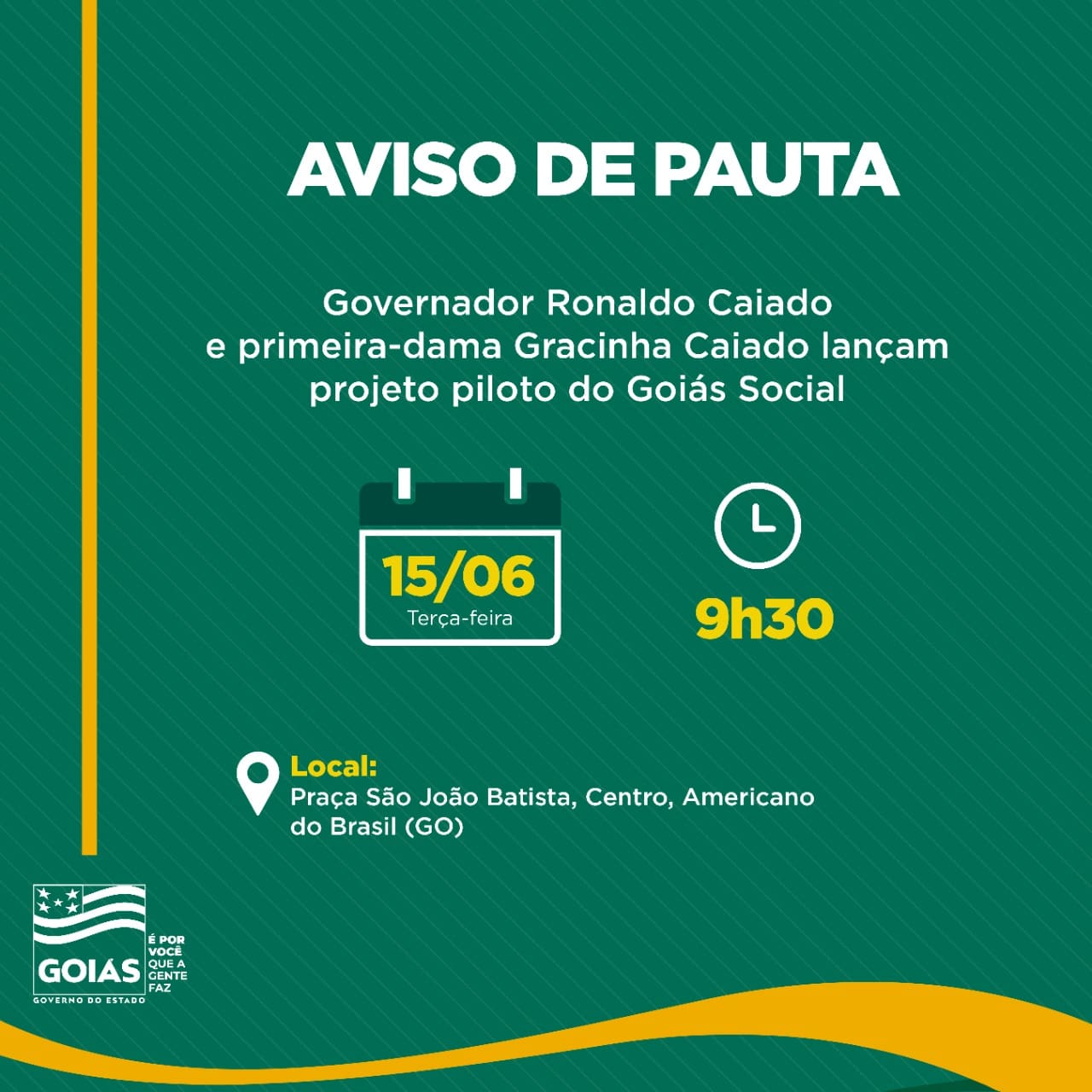 O governador Ronaldo Caiado e a presidente de honra da Organização das Voluntárias de Goiás (OVG) e coordenadora do Gabinete de Políticas Sociais (GPS), primeira-dama Gracinha Caiado, lançam, nesta terça-feira (15/06), às 9h30, o projeto piloto do programa Goiás Social, no município de Americano do Brasil, no Centro goiano.