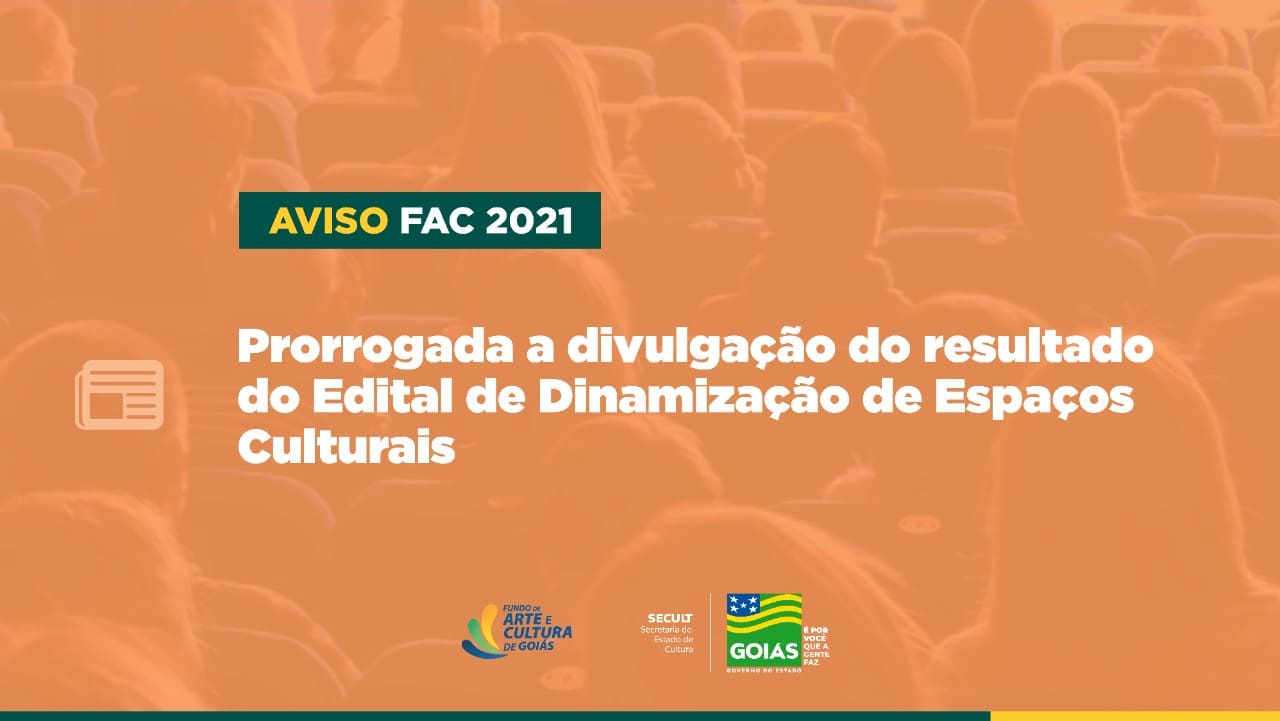 O Governo de Goiás, por meio da Secretaria de Estado de Cultura (Secult), comunica que a divulgação dos projetos classificados no edital de Dinamização de Espaços Culturais, do Fundo de Arte e Cultura (FAC), está programada para o dia 13 de outubro.