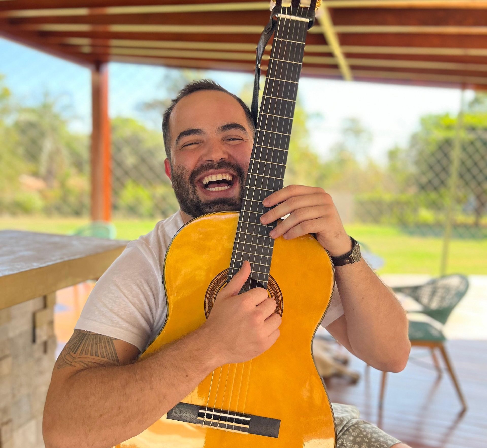 “Era um Violão Giannini Série Estudo. Logo que ganhei esse presente me matriculei para aprender a tocar. Na época, eu morava em Itumbiara, interior de Goiás, e lembro que fiz aulas com uma professora de música chamada Priscila. Fiz seis meses de aula, o restante aprendi por conta própria. Deus foi generoso na minha dose de perseverança”, conta.