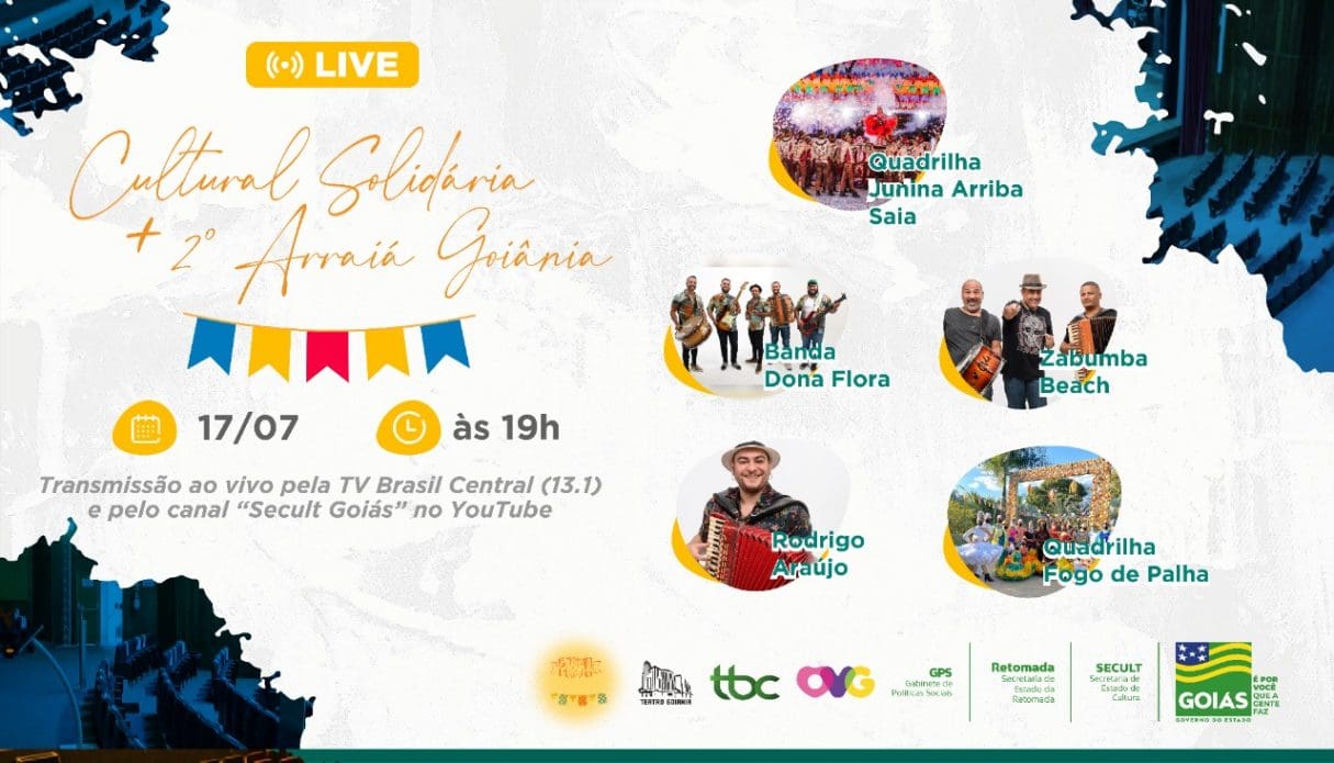 O Governo de Goiás, por meio da Secretaria de Estado de Cultura (Secult), realiza, no sábado (17/7), a 4ª Live Cultural Solidária, que, nesta edição, se une ao 2º Arraiá Goiânia. Outro diferencial é que ela será um evento-teste híbrido. Além da transmissão ao vivo para o público de casa, a equipe irá convidar cerca de 360 pessoas para assistir ao show presencialmente (50% da capacidade do Teatro Goiânia). Os convidados serão pessoas que tenham recebido ao menos a primeira dose da vacina contra a Covid-19 (será preciso apresentar o cartão de vacinação). Todos também terão que apresentar teste RT-PCR negativo feito nas últimas 48 horas anteriores ao evento.