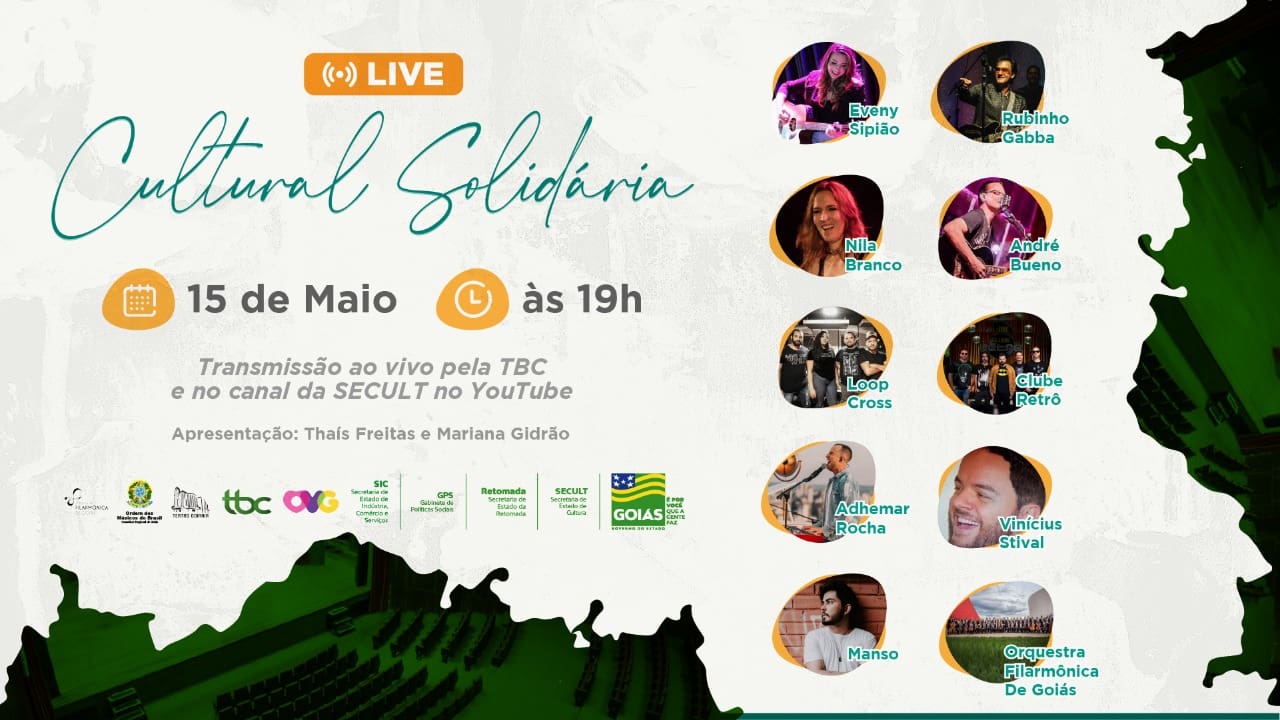 O Governo de Goiás, por meio da Secretaria de Estado de Cultura (Secult), realiza no dia 15 de maio, às 19h, a 2ª edição da Live Cultural Solidária, transmitida ao vivo direto do palco do Teatro Goiânia. Desta vez, o evento beneficente apresentará clássicos do pop rock interpretados pelas bandas goianas Loop Cross e Clube Retrô, além de cantores da cena de rock independente, todos acompanhados pelo grupo de cordas da Orquestra Filarmônica de Goiás (OFG). Estão confirmadas nesta edição as participações especiais de Nila Branco, Vinícius Stival, Andre Buenno, Rubinho Gabba, Eveny Sipião e Adhemar Rocha.
