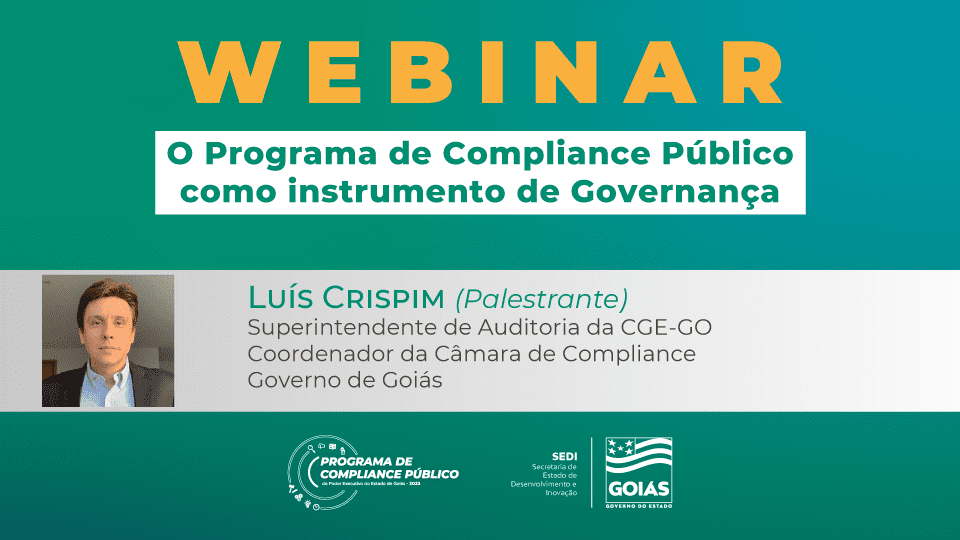 No próximo dia 4 (quarta-feira), às 9h, o superintendente de Auditoria da CGE-GO e coordenador da Câmara de Compliance – Governo de Goiás, Luís Crispim, vai falar aos servidores da Sedi e interessados sobre o Programa Compliance como instrumento de Governança. O webinar será transmitido no canal da Sedi no YouTube.