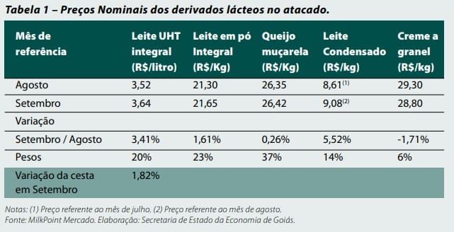 A média ponderada é calculada a partir da variação dos preços de uma cesta de produtos lácteos que representa o mix médio de derivados produzidos pelos laticínios no Estado de Goiás. São cinco os produtos considerados: leite UHT integral, leite em pó integral, queijo muçarela de barra, leite condensado e creme de leite a granel. O cálculo leva em consideração os preços recebidos pela indústria no mercado atacadista.