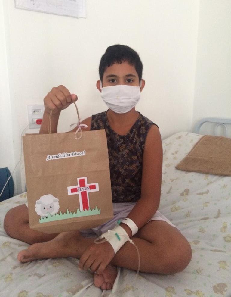 Os pequenos pacientes também receberam presentes. Um total de 60 kits, com livros bíblicos, giz de cera, tela e tintas, foram entregues às crianças internadas na unidade. Todas ficaram com um sorriso no rosto, na certeza de uma Páscoa mais colorida.