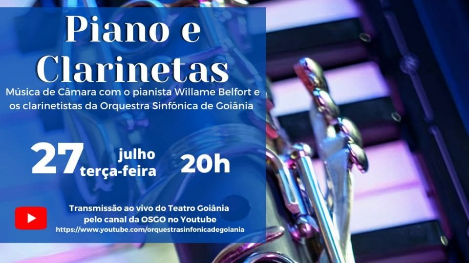 O Teatro Goiânia, unidade da Secretaria de Cultura (Secult Goiás), recebe nesta terça-feira, 27 de julho, às 20h, a Orquestra Sinfônica de Goiânia, em um espetáculo online de música de câmara variado, com o pianista convidado Willame Belfort e os clarinetistas Pedro Alliprandini e Vanderlei Alves.